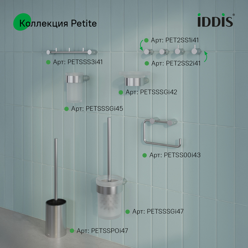 - Petite – базовая коллекция функциональных аксессуаров для ванной с минималистичным, спокойным дизайном и округлыми формами, что делает её универсальным украшением любого современного санузла. Аксессуары в универсальном матовом хроме преобразят интерьер, сделают его завершённым и гармоничным. Идеально дополнят смесители IDDIS® из коллекций Aiger по цвету и форме.