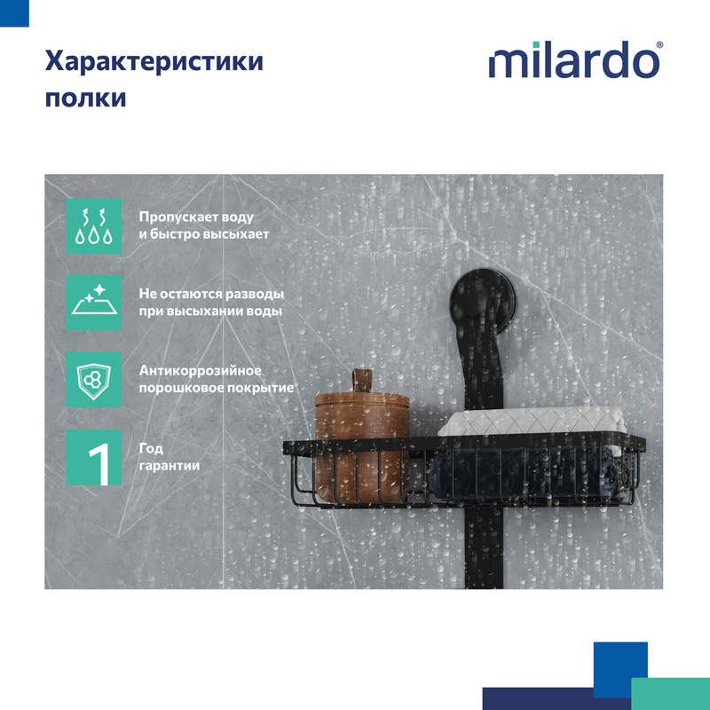 • В отличие от изделий из пластика полка Milardo® может выдерживать высокую (до 7 кг) нагрузку. Она монтируется без сверления, а значит можно не опасаться повредить красивую плитку или другое настенное покрытие.
