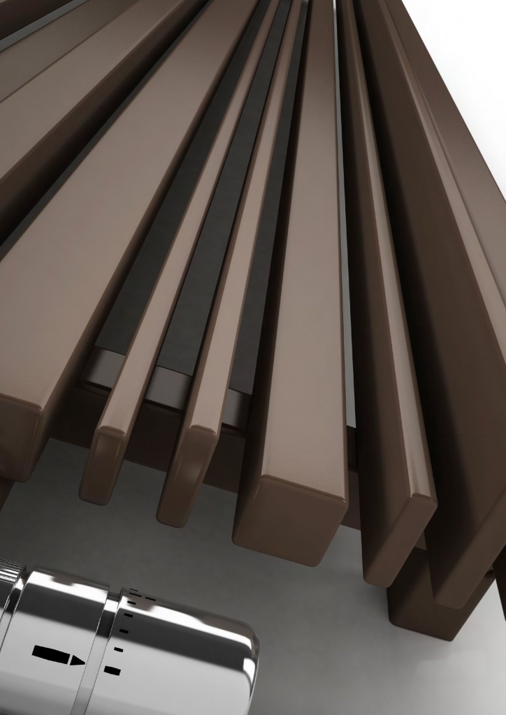 Перед нами - не формально называемый "дизайн-радиатором", а действительно имеющий право так называться объект - вертикальный радиатор водяного Terma Sherwood V 1300 x 330 мм. Состоящий из набора (конкретно для этого радиатора - из семи) вертикальных трубок разного профиля - квадратного и прямоугольного разных размеров, этот радиатор действительно напоминает могучий лес вдали. Мы предоставляем вам и вашему дизайнеру возможность окрасить этот радиатор в любые цвета, причем не только из палитры RAL, но и из дополнительных таблиц Terma, предлагающих почти три десятка вариантов светлых и темных тонов.