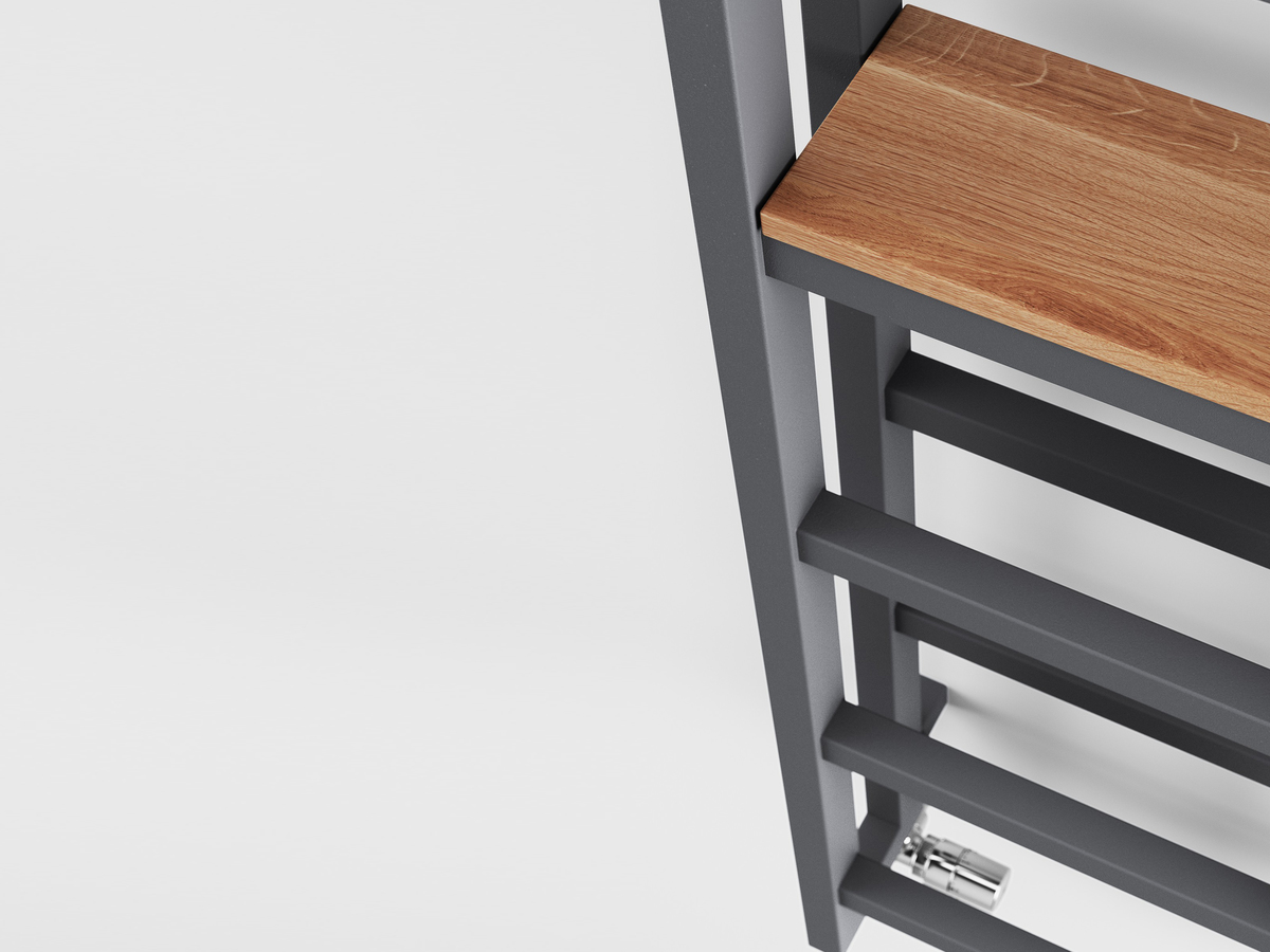 Черный полотенцесушитель Terma Stand 920x400 - неплохо впишется в ванную комнату урбанистического стиля, также эта модель сможет не только украсить вашу кухню, но и сделает ее более удобной. Огромный выбор по ширине - 300 мм, 400 мм, 500 мм, и высоте - 920 мм, 1150 мм, 1380 мм, 1610 мм и возможность установить деревянные полочки из таких ценных пород дерева - бук, дуб и тик, сделает ваш окончательный выбор в пользу STAND.