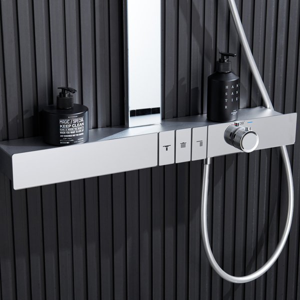 LED дисплей (индикация температуры и времени) на душевой штанге, две полочки из закалённого стекла (237x105 мм).