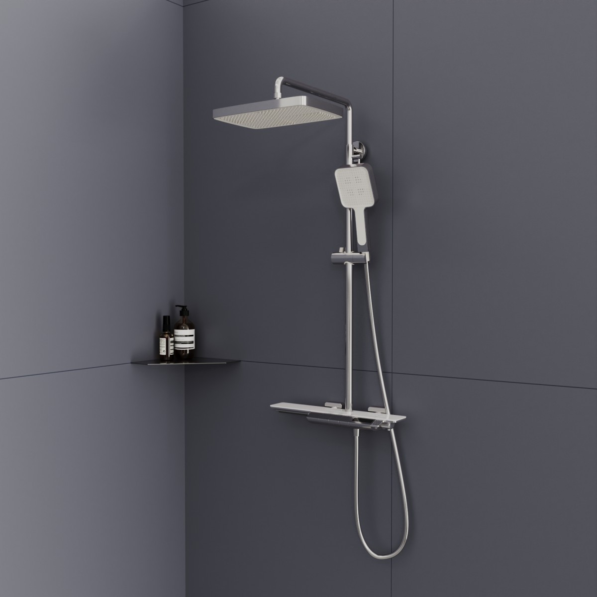 - Вместительная стеклянная полка для душевых принадлежностей;