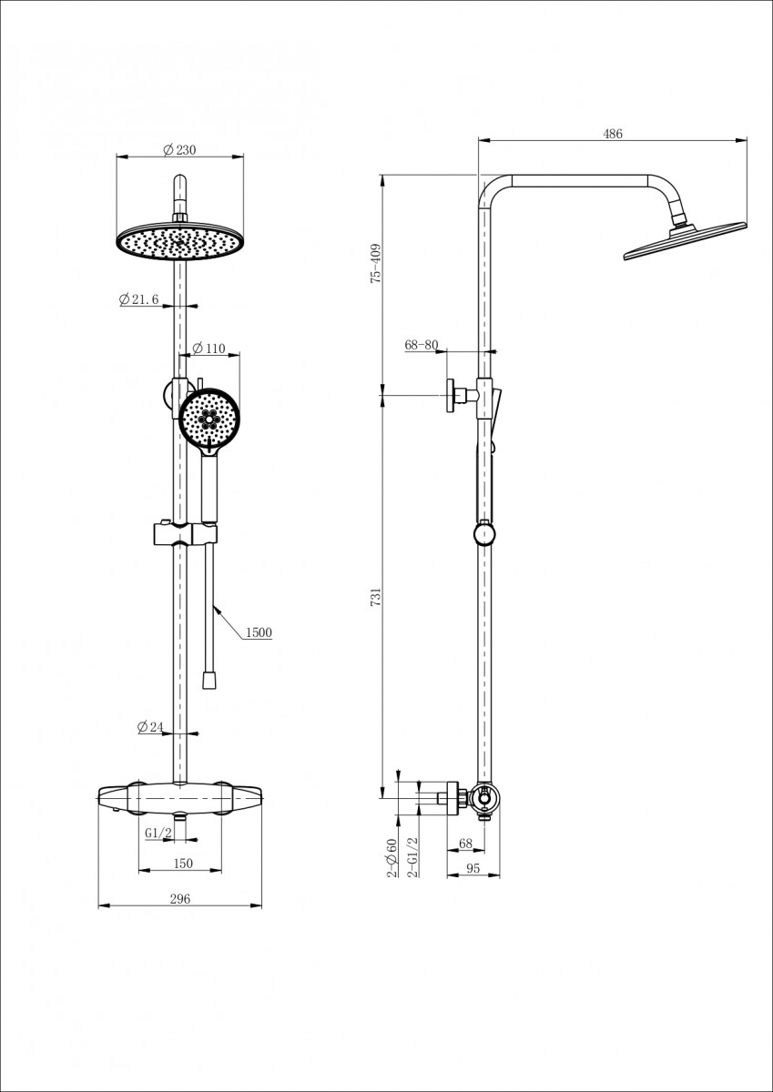 - Комплектация Смеситель / Душевой шланг/ Держатель для душа / Душевая штанга / Верхний душ / Душевая лейка / Эксцентрики / Монтажный комплект