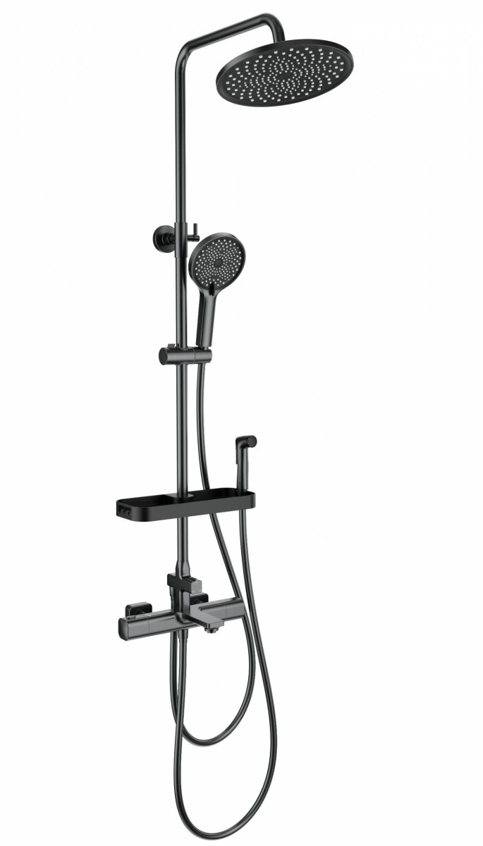 - Комплектация Смеситель / Душевой шланг - 150 см / Душевой шланг - 120 см / Держатель для душа / Душевая штанга / Верхний душ / Душевая лейка / Лейка гигиенического душа / Полка / Эксцентрики / Монтажный комплект
