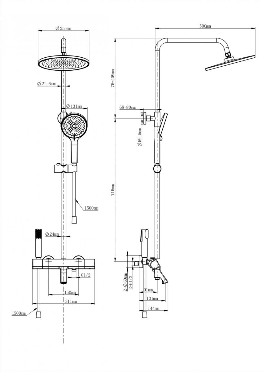 - Комплектация Смеситель / Душевой шланг/ Держатель для душа / Душевая штанга / Верхний душ / Душевая лейка / Эксцентрики / Монтажный комплект