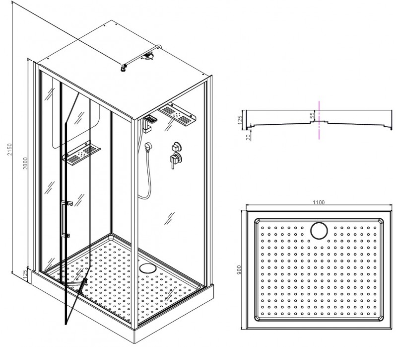Низкий поддон белого цвета (125 мм) с водонепроницаемым бортиком (20 мм);