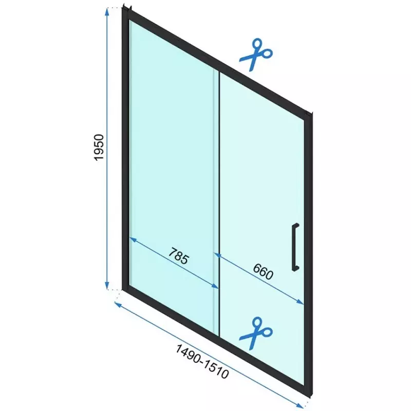 Душевая дверь Rea Rapid Slide имеет размер 1500х1950 мм. Ограждение состоит из 2 секции. Устанавливается в облицованный кафелем угол иди нишу ванной комнаты на поддон или непосредственно на пол со встроенным душевым каналом или трапом.