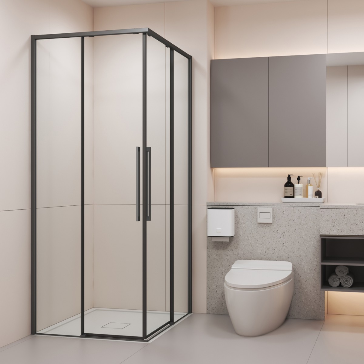 - Раздвижные двери не требуют дополнительного пространства и удобны даже в компактных ванных комнатах