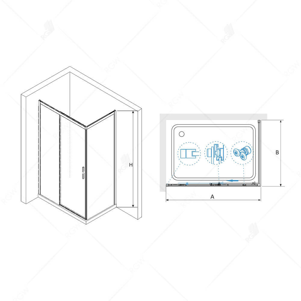 - Душевой уголок с закаленным прозрачным стеклом 6 мм, с роликовым механизмом оснащенные автодоводчиком. Угол состоит из душевой двери RGW LE-12B и боковой панели RGW Z-050-2 B. Трап или поддон приобретается отдельно.