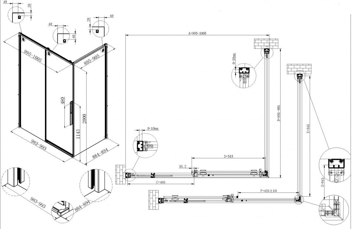 - Регулировочные размеры: 995-1005 x 895-905