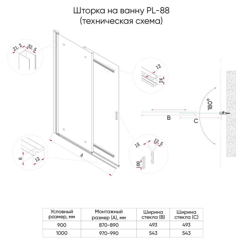 Шторка на ванну Veconi Palau PL88CH-90-01-C8 900*1400 мм (хром/прозрачное)