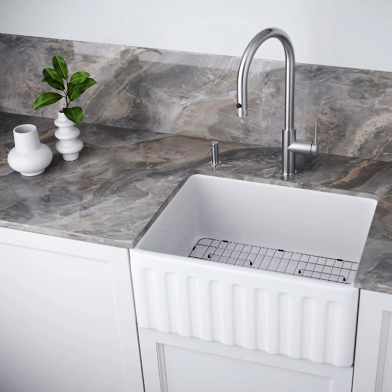 Эта стильная керамическая мойка имеет белую глянцевую поверхность, которая выделяет её на фоне любой кухни.