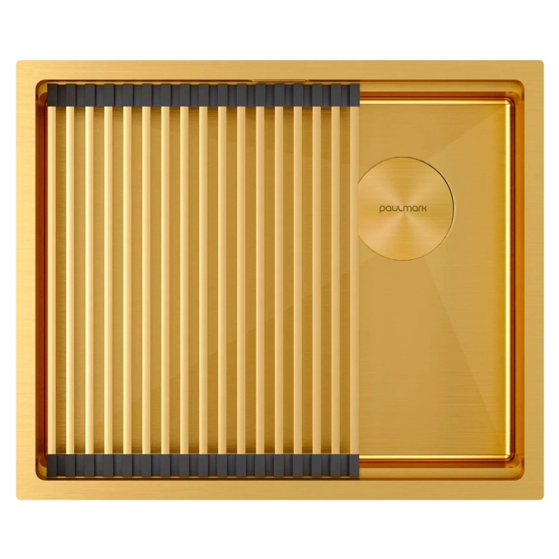 Кухонная мойка Paulmark Next Pro 54 Uni PM705445-BG. Цвет-брашированное золото. Комплектация: мойка, ролл-мат PRO в цвет мойки, декоративная накладка, комплект крепежа для врезного и подстольного монтажа, слив-перелив, сифон бутылочного типа, гарантийный талон и инструкция