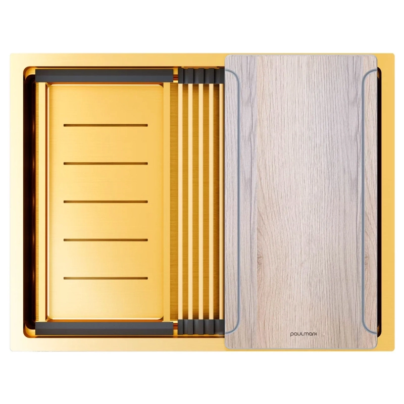 Кухонная мойка Paulmark Next Multi Sink 58 Uni 45х58 PM785845-BG. Цвет-брашированное золото. Комплектация: мойка, ролл-мат PRO в цвет мойки, коландер, разделочная доска, декоративная накладка на слив, комплект крепежа для врезного и подстольного монтажа, слив-перелив, сифон бутылочного типа, гарантийный талон и инструкция