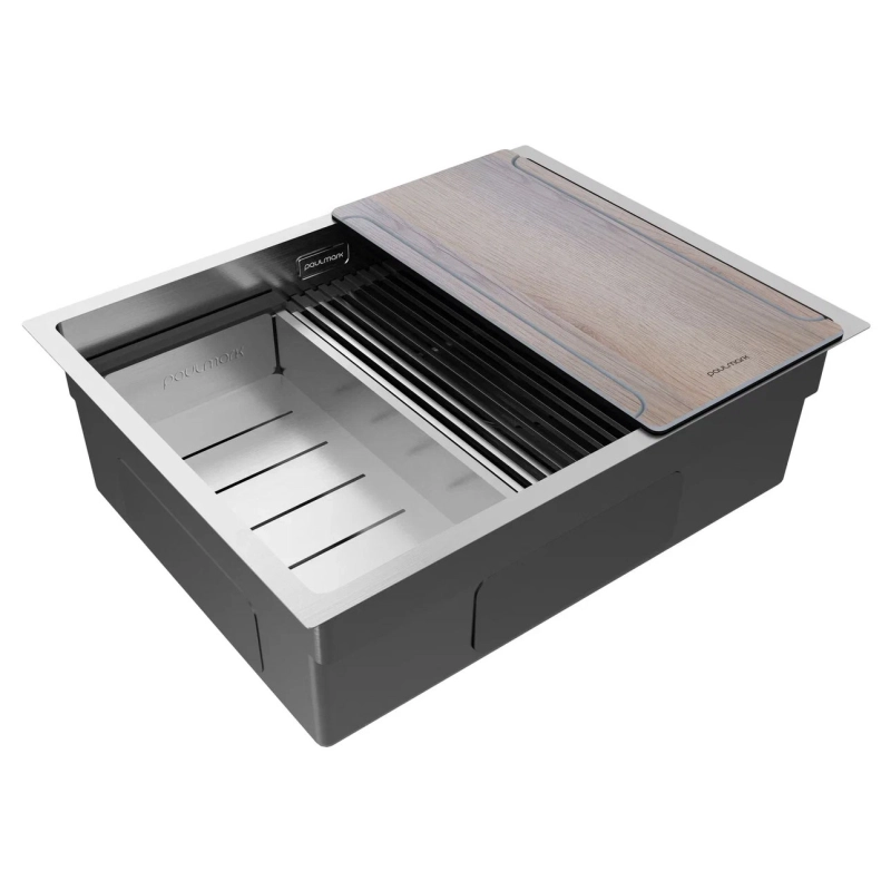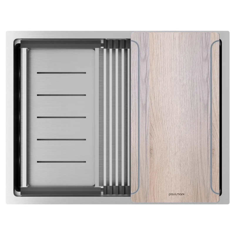 Кухонная мойка Paulmark Next Multi Sink 58 Uni 45х58 PM785845-BS. Цвет-брашированная сталь. Комплектация: мойка, ролл-мат PRO в цвет мойки, коландер, разделочная доска, декоративная накладка на слив, комплект крепежа для врезного и подстольного монтажа, слив-перелив, сифон бутылочного типа, гарантийный талон и инструкция
