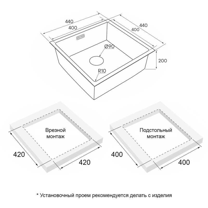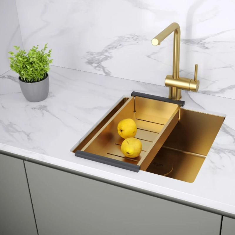 Кухонная мойка Paulmark Next 44 Uni 44х44 PM214444-BG. Цвет-брашированное золото. Имеет гладкую поверхность, на которой отсутствуют поры, способные задерживать загрязнения, благодаря чему капли воды становятся практически незаметны, а пятна и следы использования можно легко удалить. Возможен подстольный, накладной монтаж или монтаж вровень со столешницей. Комплектация: мойка, комплект крепежей для врезного монтажа, комплект для подстольного монтажа, слив-перелив, сифон
