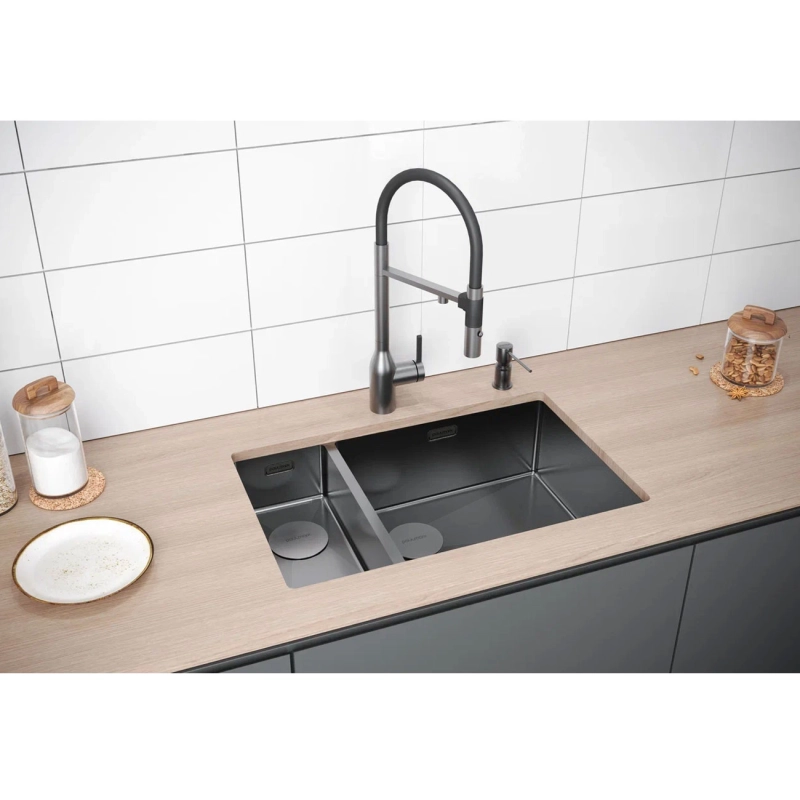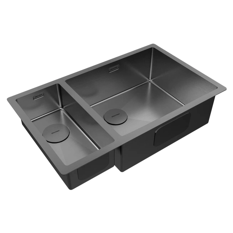 Кухонная мойка Paulmark Next 69/2S Uni 44х69 PM226944-GMR правая. Цвет-вороненая сталь. Комплектация: мойка, декоративная накладка на слив-2 шт, комплект крепежа для врезного и подстольного монтажа, слив-перелив, двойной сифон бутылочного типа