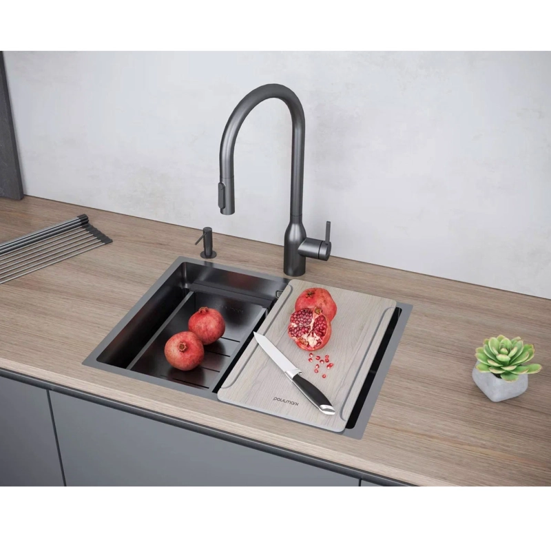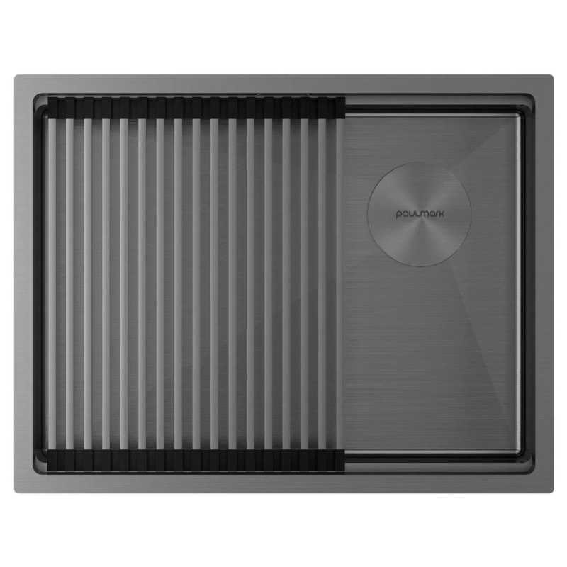 Кухонная мойка Paulmark Next Pro 58 Uni 45х58 PM705845-GM. Цвет-вороненая сталь. Комплектация: мойка, ролл-мат PRO в цвет мойки, декоративная накладка, комплект крепежа для врезного и подстольного монтажа, слив-перелив, сифон бутылочного типа, гарантийный талон и инструкция