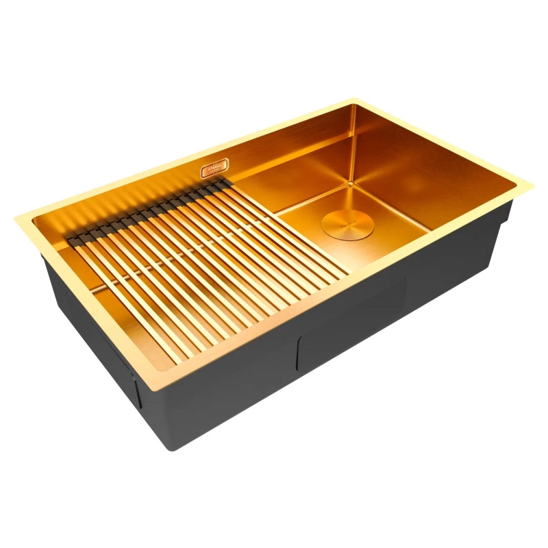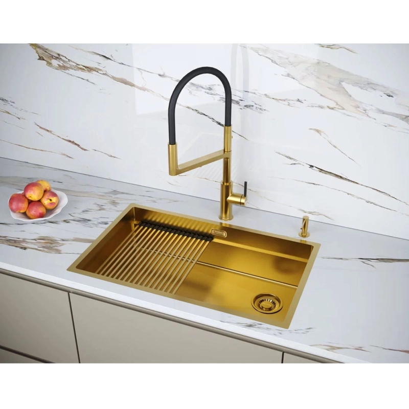 Кухонная мойка Paulmark Next Pro 74 Uni 45х74 PM707445-BG. Цвет-брашированное золото. Комплектация: мойка, ролл-мат PRO в цвет мойки, декоративная накладка, комплект крепежа для врезного и подстольного монтажа, слив-перелив, сифон бутылочного типа, гарантийный талон и инструкция