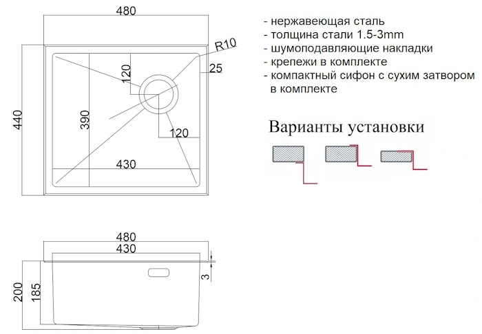 Мойка, сливная арматура с корзинчатым вентилем 3 1/2, специальный отводной сифон с сухим затвором и возможность подключения стиральной или посудомоечной машины, комплект креплений.