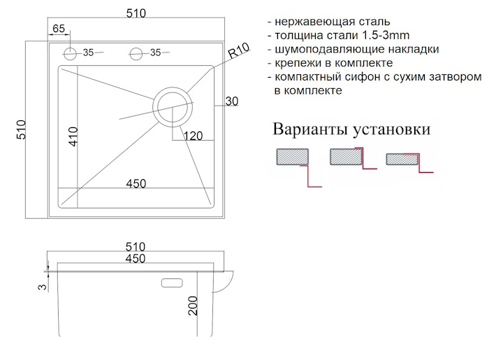 Мойка, сливная арматура с корзинчатым вентилем 3 1/2, специальный отводной сифон с сухим затвором и возможность подключения стиральной или посудомоечной машины, комплект креплений.