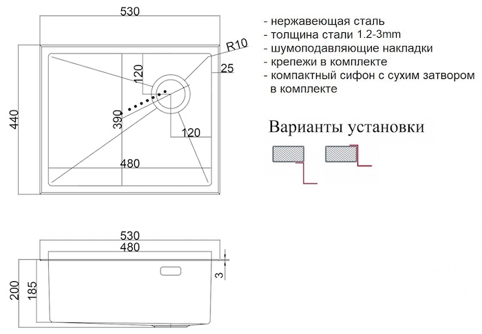 Мойка, сливная арматура с корзинчатым вентилем 3 1/2, специальный отводной сифон с сухим затвором и возможность подключения стиральной или посудомоечной машины, комплект креплений.