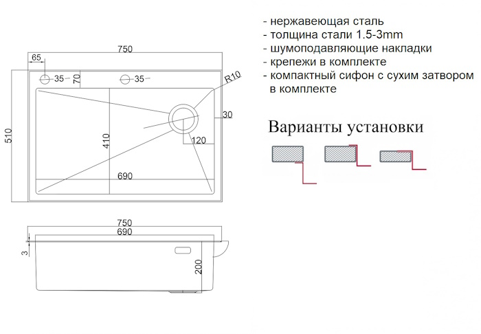 Мойка, сливная арматура с корзинчатым вентилем 3 1/2, специальный отводной сифон с сухим затвором и возможность подключения стиральной или посудомоечной машины, комплект креплений.