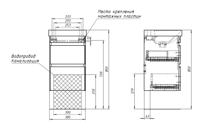 За нижним ящиком предусмотрено место для подводки коммуникаций снизу. Это упрощает монтаж и скрывает трубы. Подвесные модели можно установить на универсальные опоры высотой 200 мм.