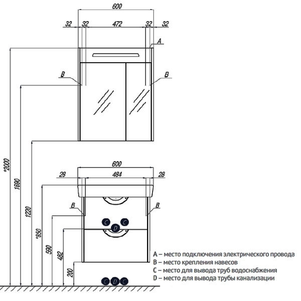 - Высота тумбы с раковиной +-5мм(если нет опор): 650 мм