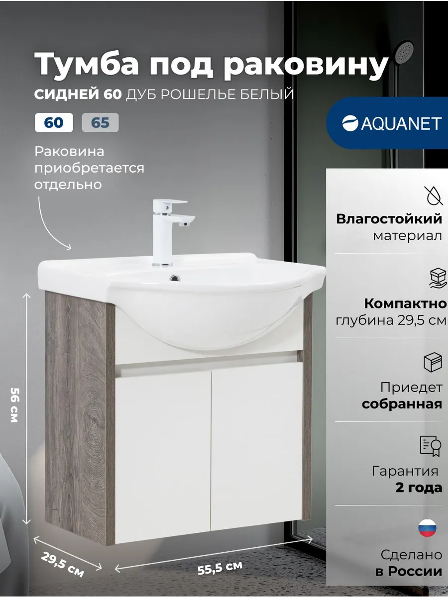 Тумба Aquanet Сидней 60 идеально подойдет для небольших ванных комнат. Ее компактные размеры не мешают размещению просторной керамической раковины с глубокой чашей. Двухцветное оформление "дуб рошелье/белый" делает модель универсальной для разных стилей интерьера.