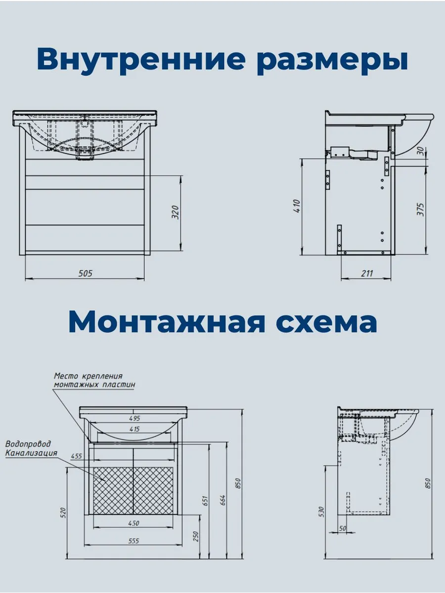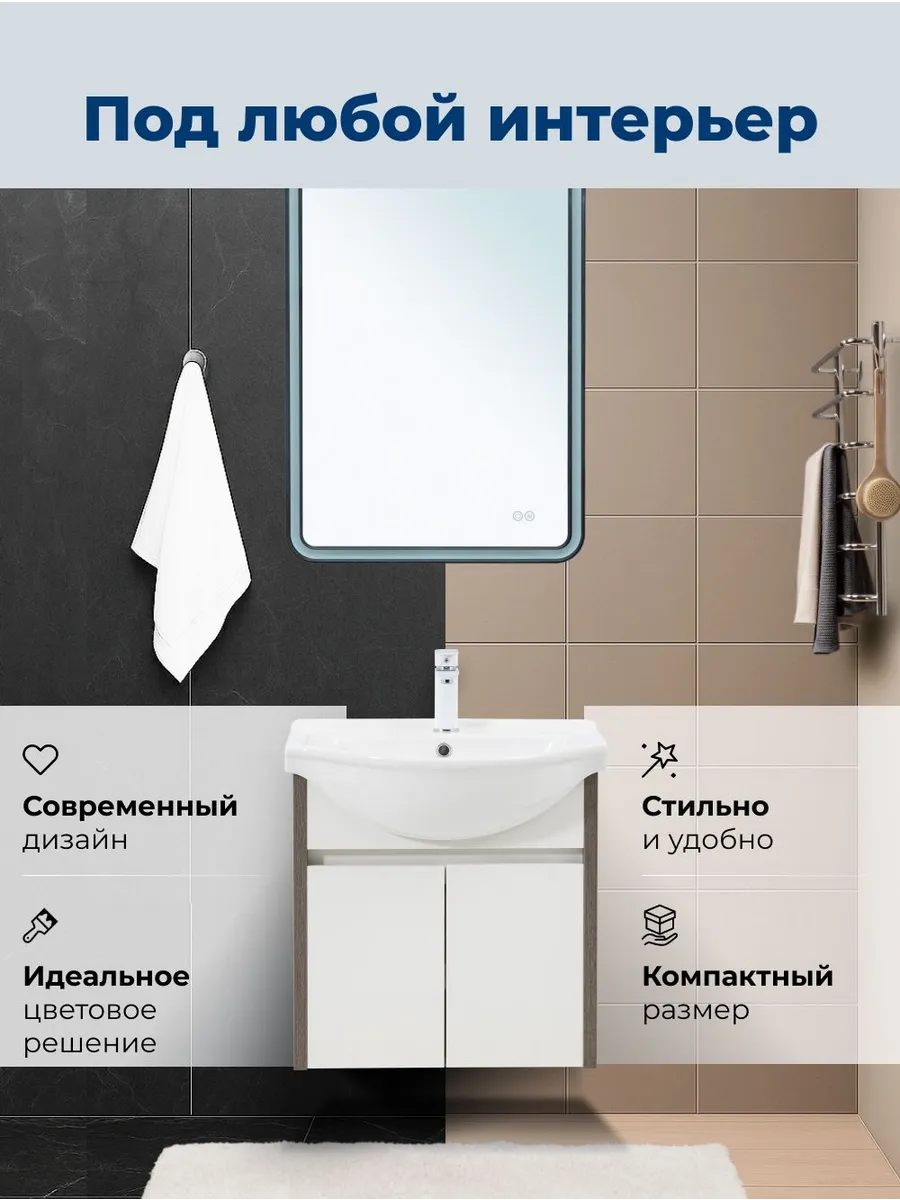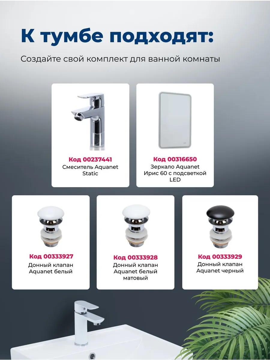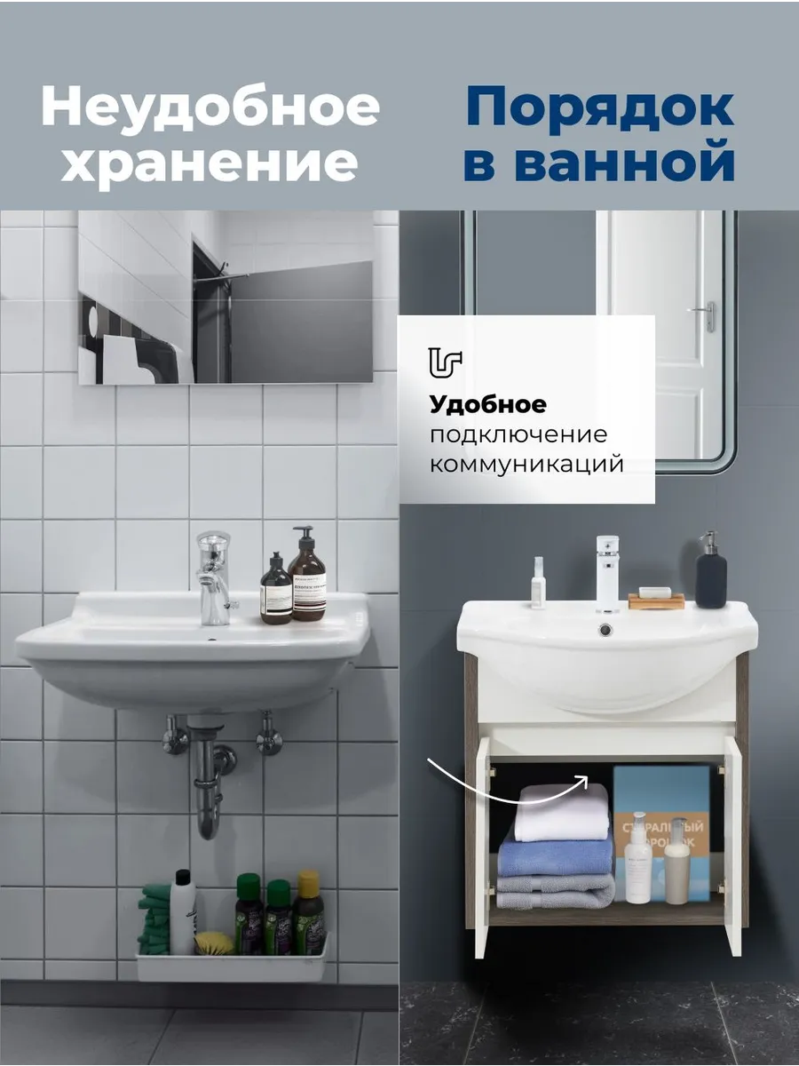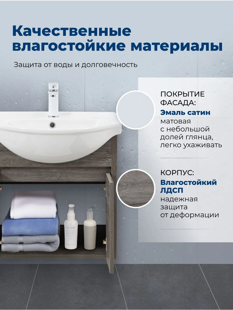 Практичные влагостойкие материалы обеспечивают долгий срок службы даже в условиях повышенной влажности. Пространство под тумбой организовано с учетом необходимости подвода коммуникаций, что делает монтаж удобным и быстрым.