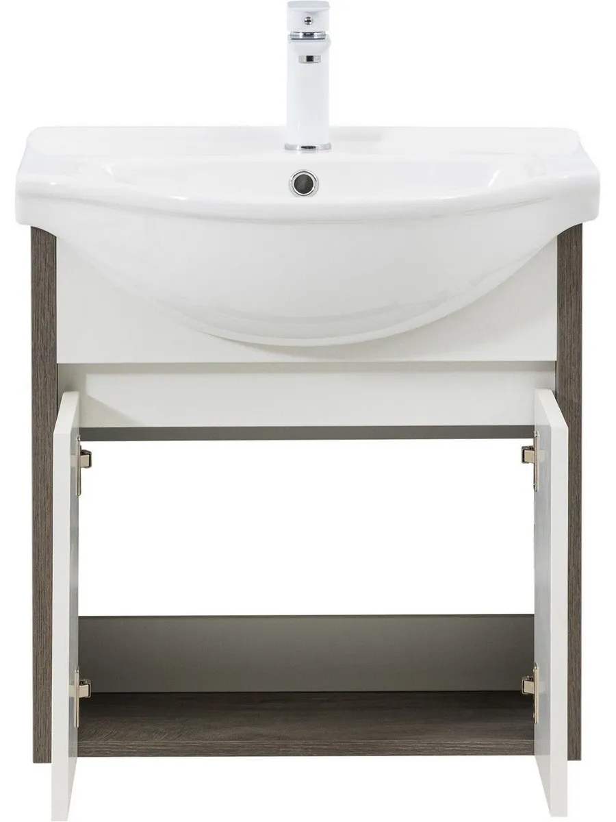 Компактная тумба под раковину Aquanet Сидней 60 сочетает в себе практичность и стильный дизайн. Модель выполнена в двухцветном оформлении - теплый оттенок "дуб рошелье" на фасадах гармонично сочетается с белыми элементами.