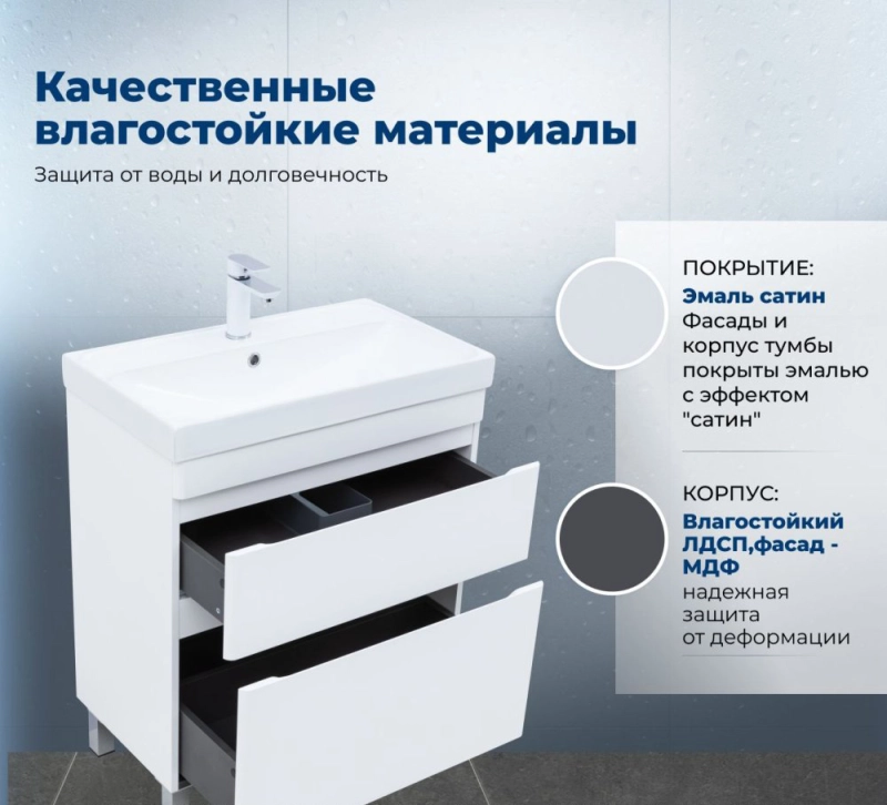 Корпус выполнен из влагостойкой ЛДСП с покрытием эмаль в цвете белый сатин. Фасады изготовлены из МДФ с таким же покрытием. Эмаль с эффектом "сатин" придаёт поверхности лёгкий благородный блеск. Такое покрытие устойчиво к загрязнениям и отпечаткам пальцев. Уход за фасадами не требует усилий.