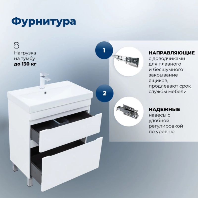 За нижним ящиком предусмотрено место для подводки коммуникаций снизу. Это упрощает монтаж и скрывает трубы. Напольная тумба уже укомплектована четырьмя металлическими опорами.