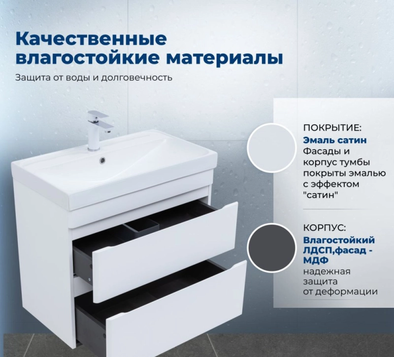 Корпус выполнен из влагостойкой ЛДСП с покрытием эмаль в цвете белый сатин. Фасады изготовлены из МДФ с таким же покрытием. Эмаль с эффектом "сатин" придаёт поверхности лёгкий благородный блеск. Такое покрытие устойчиво к загрязнениям и отпечаткам пальцев. Уход за фасадами не требует усилий.