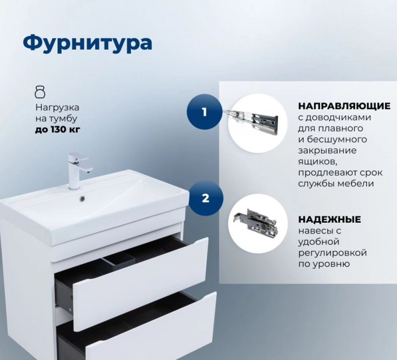 Направляющие скрытого монтажа оснащены доводчиками. Они обеспечивают плавное и бесшумное закрывание ящиков. Навесы выдерживают нагрузку до 130 кг, гарантируя устойчивость фасадов.