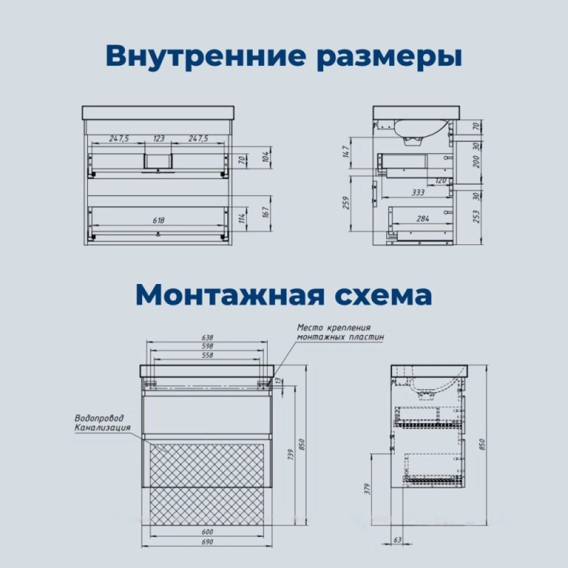 За нижним ящиком предусмотрено место для подводки коммуникаций снизу. Это упрощает монтаж и скрывает трубы. Подвесные модели можно установить на универсальные опоры высотой 200 мм.