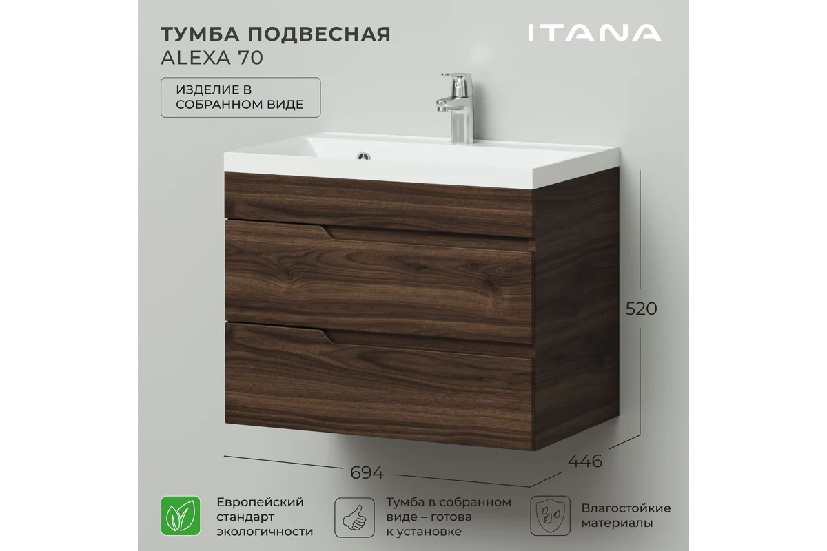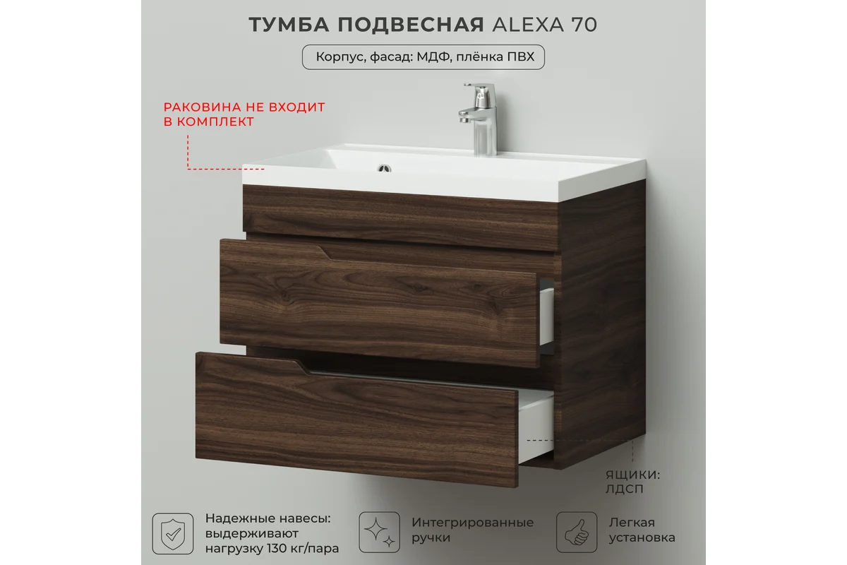 Тумба под раковину Итана Alexa 4657834373181 70 см (орех пекан шоколад стронг) подвесная