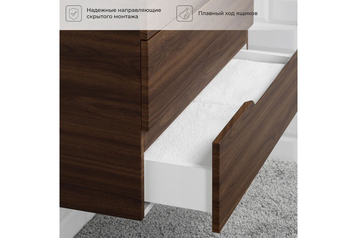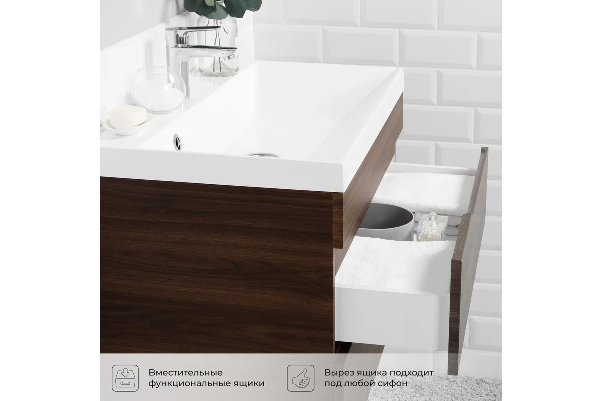 Откройте для себя идеальное решение для вашей ванной комнаты – тумбу под раковину Итана Alexa 70. Этот элегантный предмет интерьера сочетает в себе современный дизайн и максимальную функциональность, что делает его незаменимым в любом санузле. Тумба для ванной Итана Alexa 70 имеет размеры 694х446х520 мм, что обеспечивает достаточное пространство для хранения ваших принадлежностей, при этом не занимая много места. Одним из главных преимуществ этой подвесной тумбы для ванной является ее универсальность. Подвесной дизайн облегчает уборку пола под тумбой, позволяя вам поддерживать чистоту и порядок с минимальными усилиями. Встроенные современные механизмы открытия и закрытия ящиков обеспечивают плавное и бесшумное использование, что особенно важно в утренние часы или поздно вечером, чтобы не беспокоить домашних. Использованные материалы и качество сборки гарантируют долговечность и надежность тумбы. Продуманная конструкция и изящные линии идеально впишутся в любую стилистику ванной комнаты, будь то классика или минимализм. Тумба под раковину Итана Alexa 70 – это не просто мебельный атрибут, а важный элемент, который будет радовать вас ежедневно своим удобством и эстетичностью. Тумба под раковину от ИТАНА разработана с учетом всех потребностей современного пользователя. Большие внутренние отделения позволяют удобно разместить все нужные предметы, будь то полотенца, косметика или бытовая химия. Это особенно полезно для небольших ванных комнат, где каждый сантиметр на счету. Пленка в цвете Орех Пекан шоколад стронг устойчива к влаге и температурным перепадам, что делает эту тумбу идеальным выбором для тех, кто ценит не только стиль, но и практичность. Для точного выбора тумбочки под раковину в ванную комнату рекомендуем обратиться к схеме замеров, которая находится на фото в карточке товара, размеры изделия могут отличаться +/-1 см в связи со спецификой производства. Тумба для ванной доставляется в предварительно собранном виде, надежно упакована.