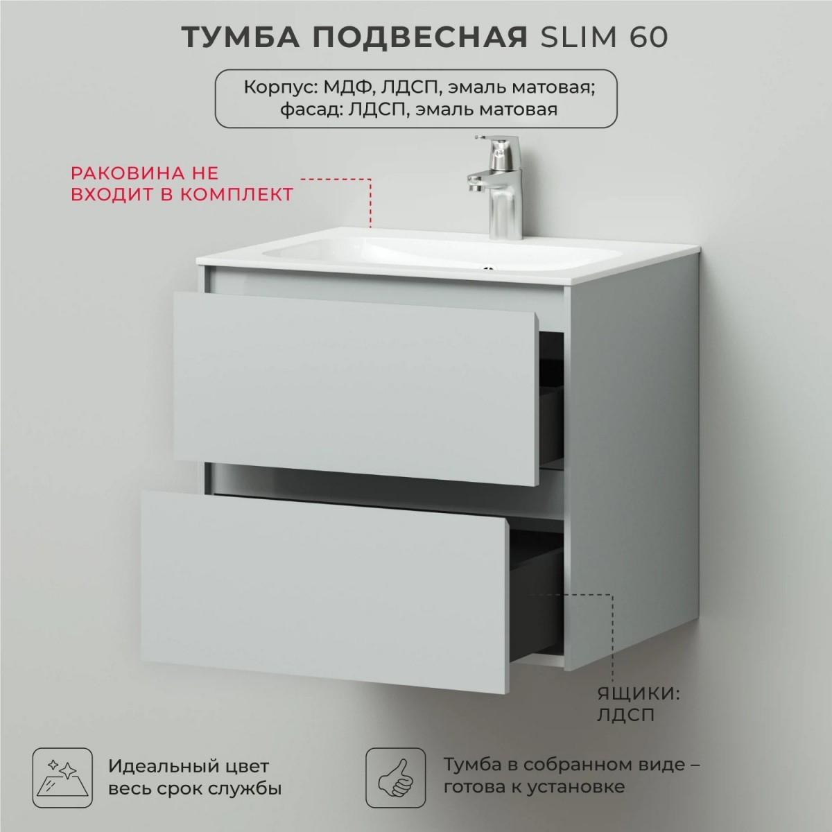В коллекции Slim безупречно воплотилась простая геометрия мебели. Идеальные прямые линии, вкладные фасады, тонкая рамка корпуса, отсутствие лицевой фурнитуры – лаконичность, которая восхищает. Коллекция выполнена из влагозащищенного МДФ, покрытого матовой эмалью. Мебель прослужит долгие годы, не теряя своего идеального внешнего вида. Укомплектуйте тумбу изящной белоснежной раковиной из искусственного камня простого дизайна. Комплект имеет подвесную систему крепления, что обеспечивает свободный доступ для поддержания чистоты в ванной комнате.