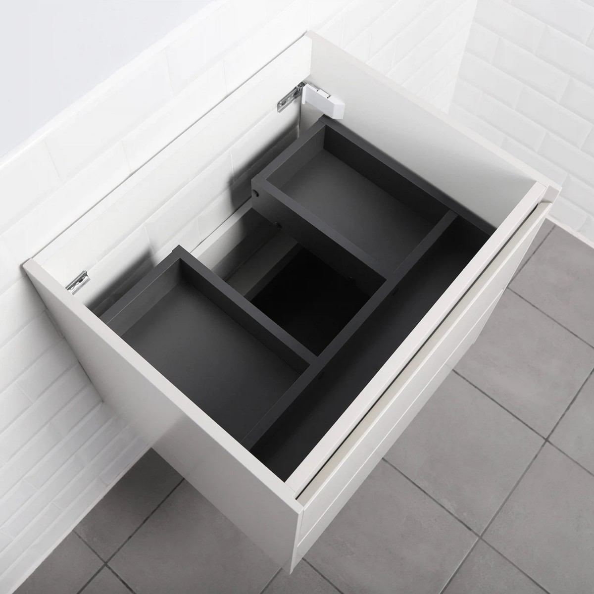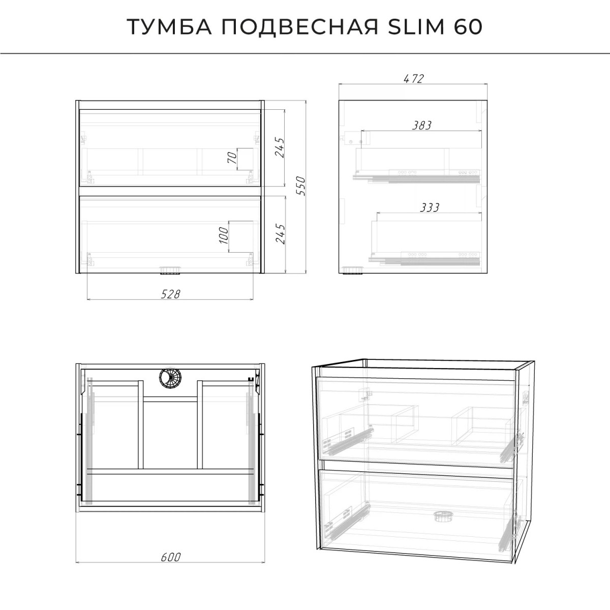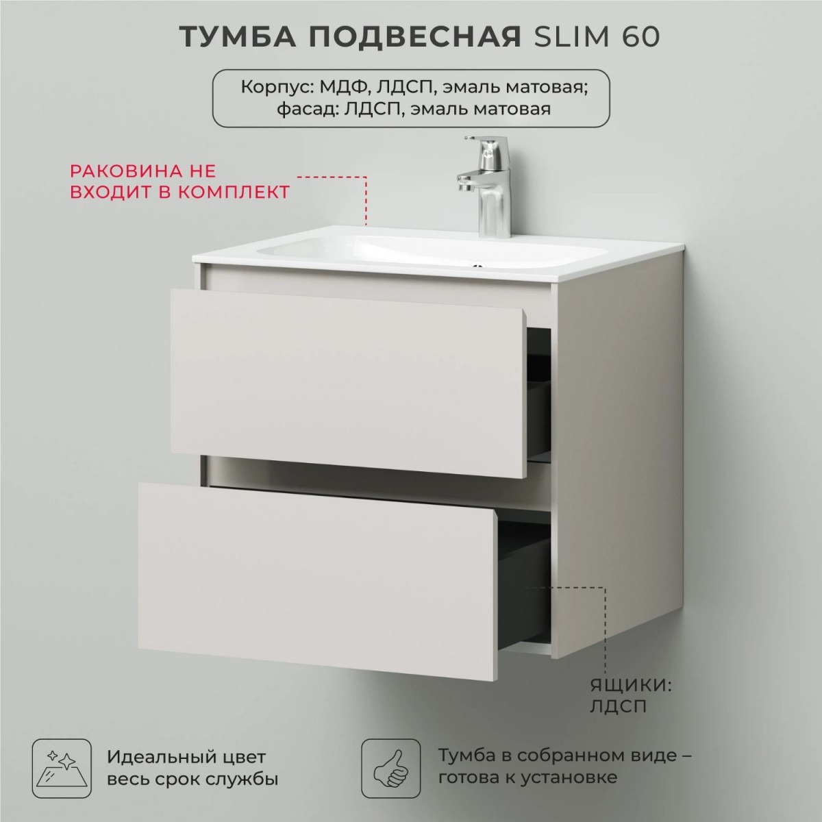 В коллекции Slim безупречно воплотилась простая геометрия мебели. Идеальные прямые линии, вкладные фасады, тонкая рамка корпуса, отсутствие лицевой фурнитуры – лаконичность, которая восхищает. Коллекция выполнена из влагозащищенного МДФ, покрытого матовой эмалью. Мебель прослужит долгие годы, не теряя своего идеального внешнего вида. Укомплектуйте тумбу изящной белоснежной раковиной из искусственного камня простого дизайна. Комплект имеет подвесную систему крепления, что обеспечивает свободный доступ для поддержания чистоты в ванной комнате.