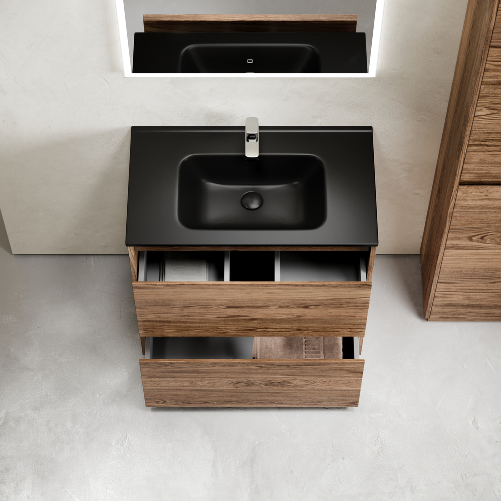 Тумба напольная Libra c двумя ящиками с доводчиками скрытого монтажа, с системой плавного закрывания и с ручкой по всей длине ящика. Каркас и фасад тумбы выполнен из ЛДСП в цвете «дуб чарльстон». Покрытие - ламинат. Основание тумбы имеет ножки c регулировкой высоты до10 мм для компенсации возможной неровности напольного покрытия. Внутреннее пространство тумбы выполнено из надежного ЛДСП серого цвета. Размер 690х450х840, артикул LB70FECH.