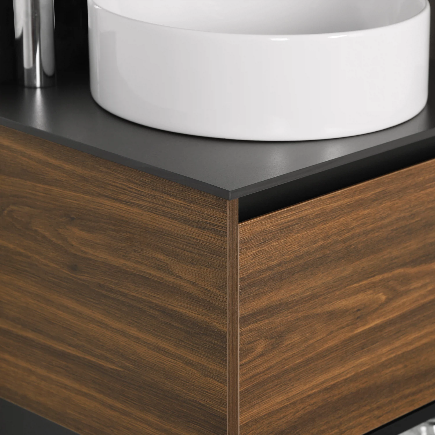Качественные направляющие скрытого монтажа обеспечат плавное открывание и закрывание тумбы со столешницей.