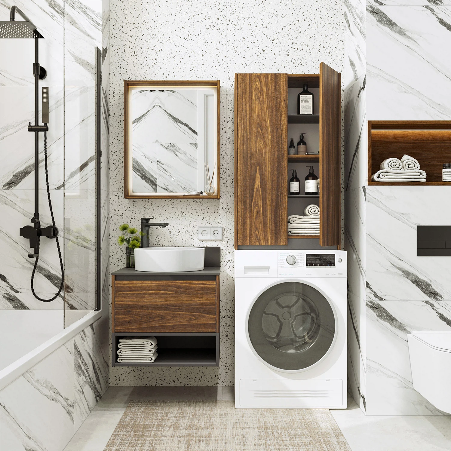 В качестве минималистичного декора выступает открытая ниша, которая обеспечит удобное хранение и легкий доступ.