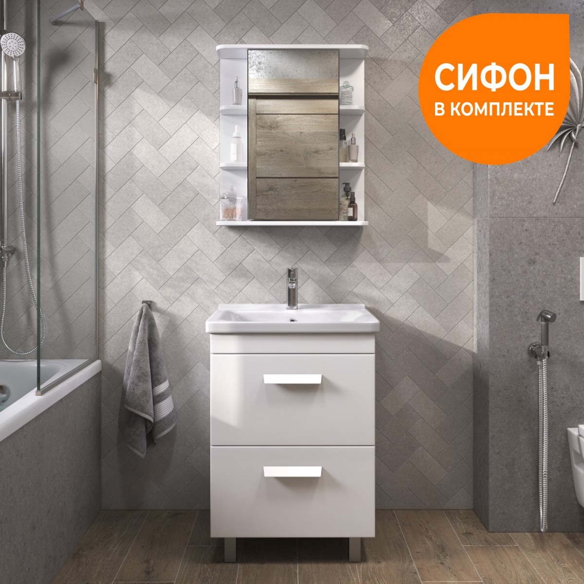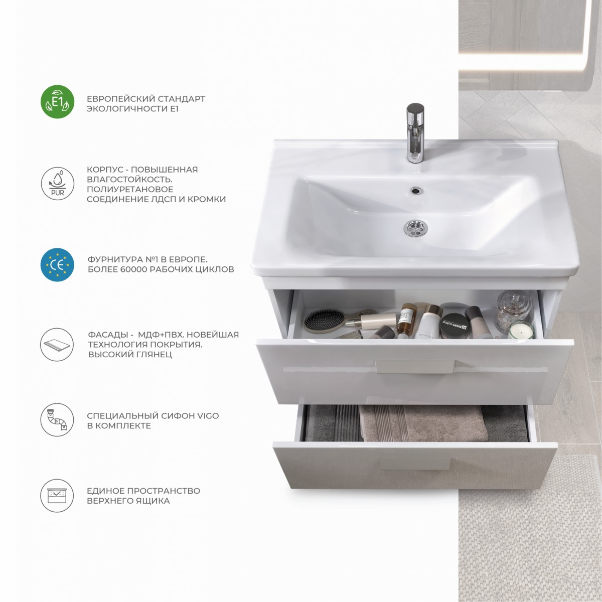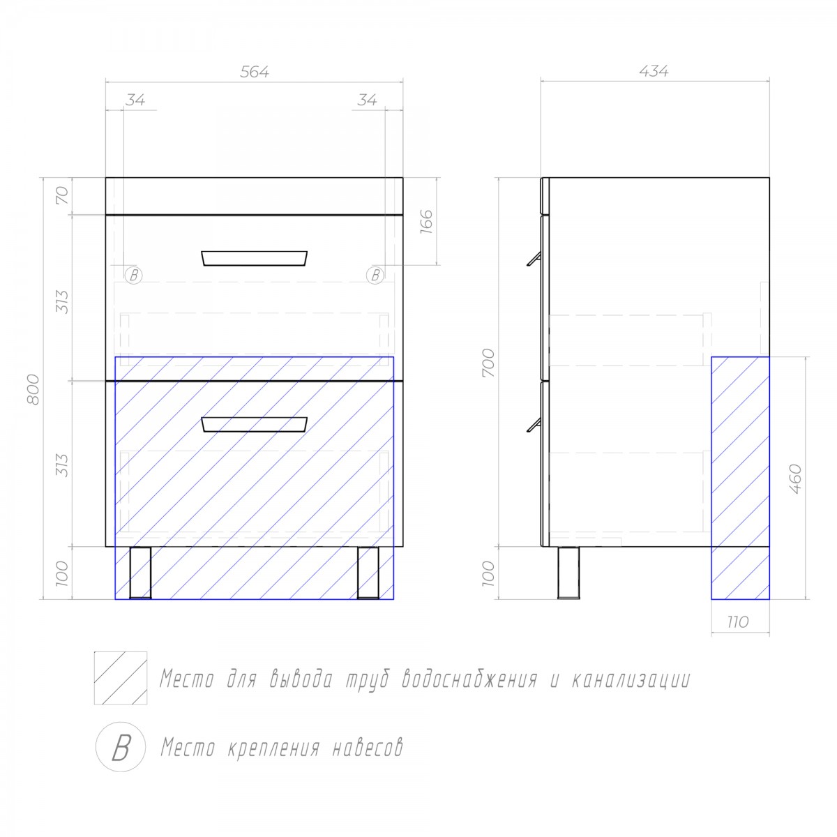 Оснащение: 2 выдвижных ящика, направляющие шариковые направляющие полного выдвижения , 2 квадратные регулируемые опоры (матовый хром), 2 навеса, сифон