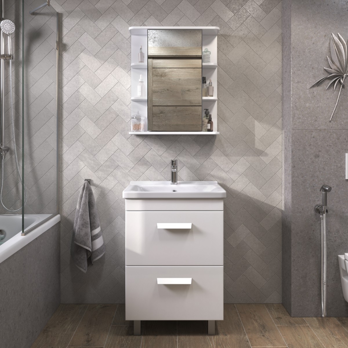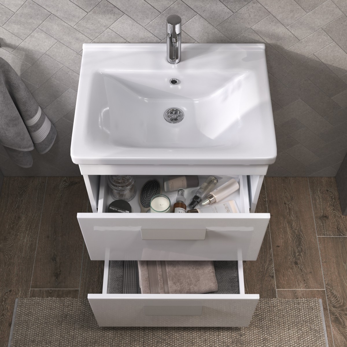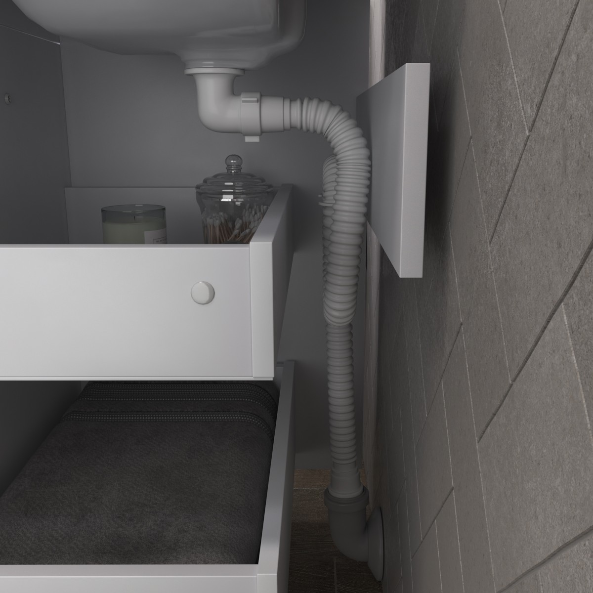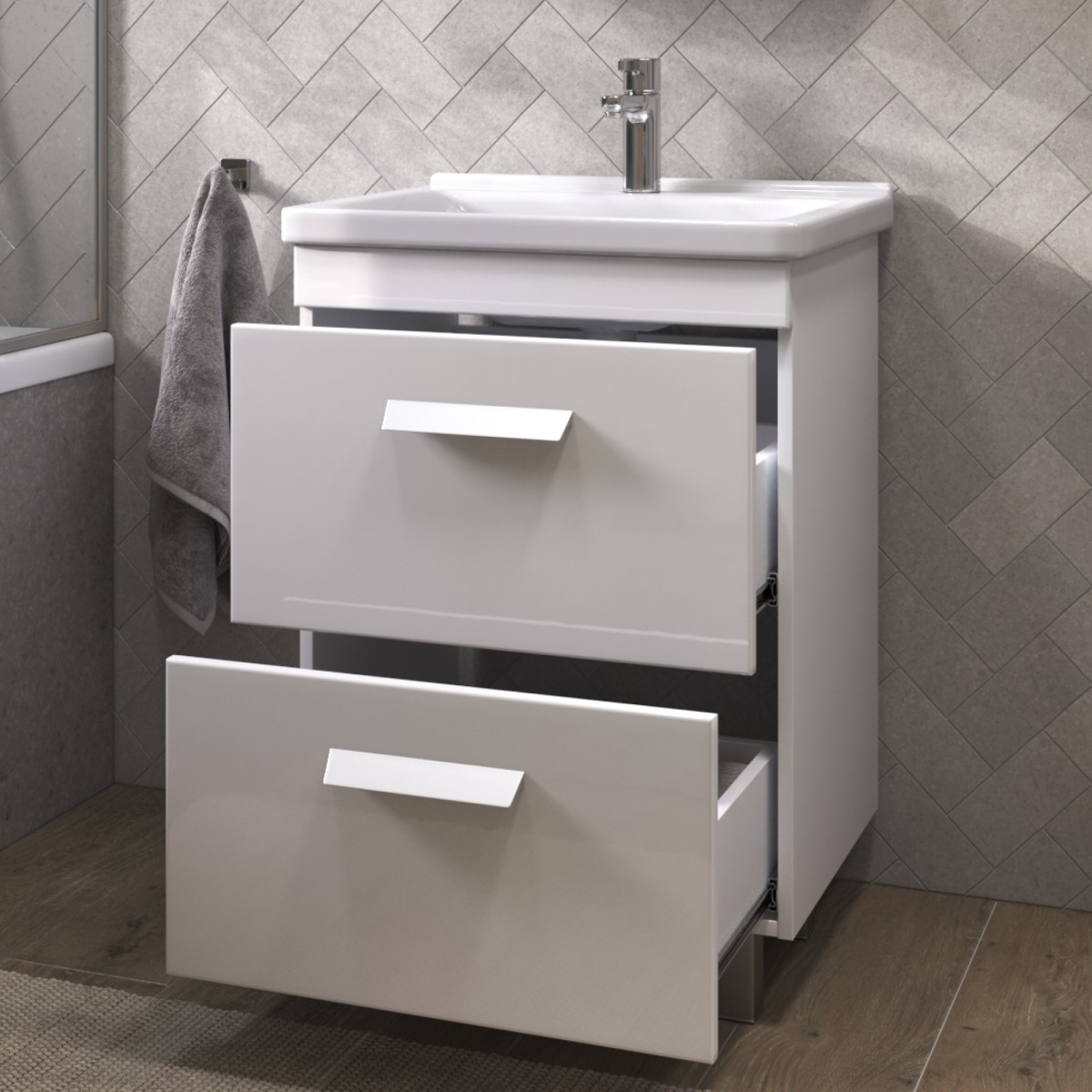 Оснащение: 2 выдвижных ящика, направляющие шариковые направляющие полного выдвижения , 2 квадратные регулируемые опоры (матовый хром), 2 навеса, сифон