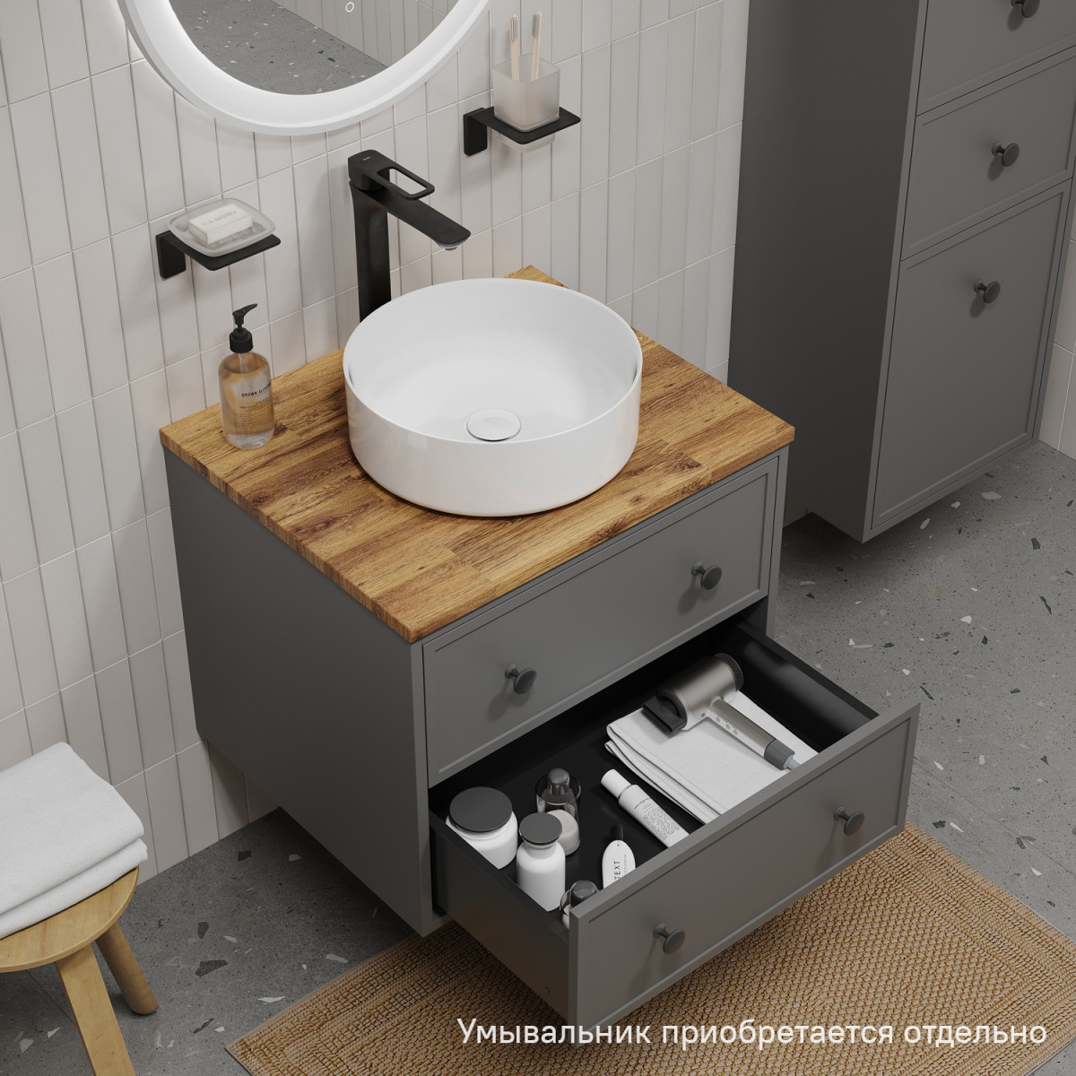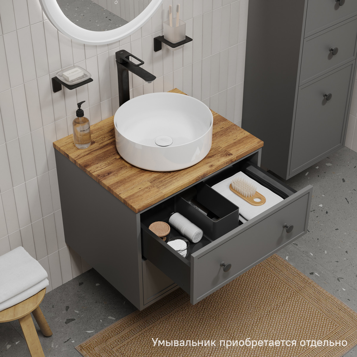 Длина изделия, мм: 480 Уникальные преимущества: Чёрные матовые ручки, накладной умывальник, ящики с механизмом плавного доведения Ширина изделия, мм: 562 Высота изделия, мм: 501 Размер изделия, мм.: 562*480*501 Цвет изделия: Темно-серый