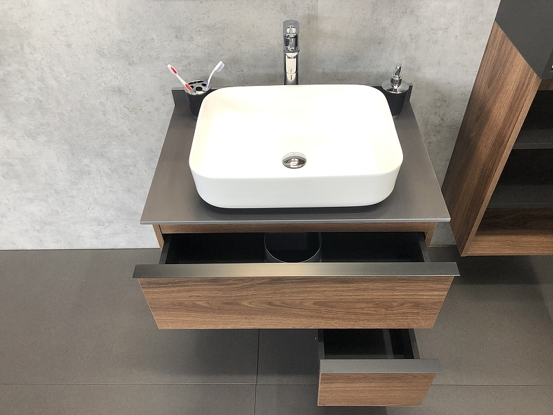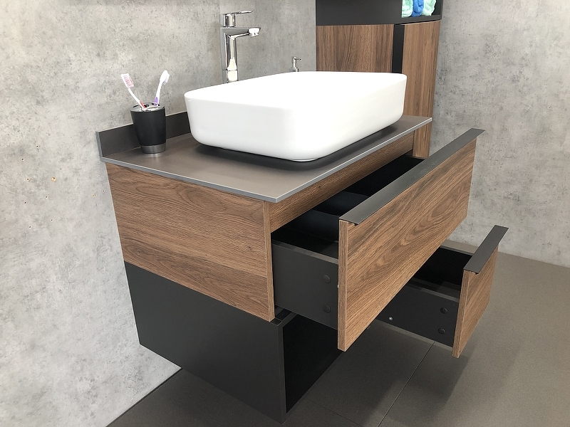 - Тумба укомплектована черными матовыми алюминиевыми ручками и столешницей, плинтусом из керамогранита и накладной прямоугольной раковиной из санфарфора.