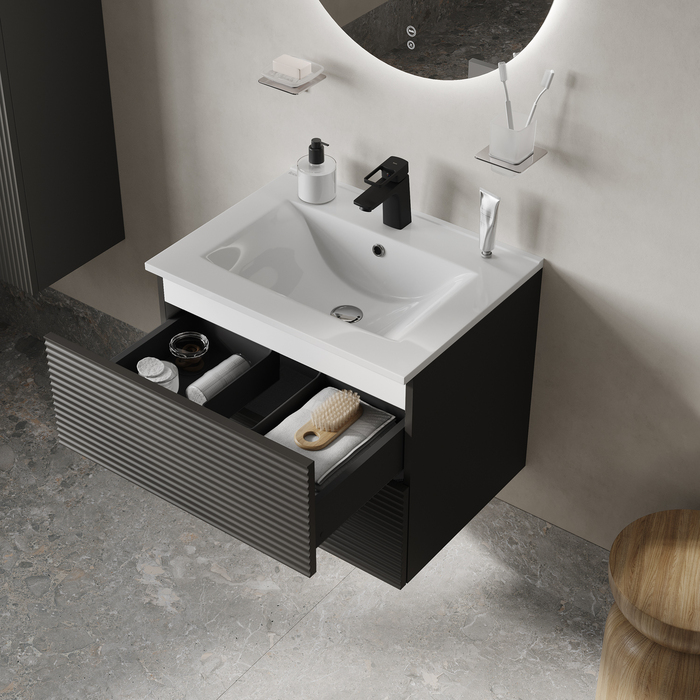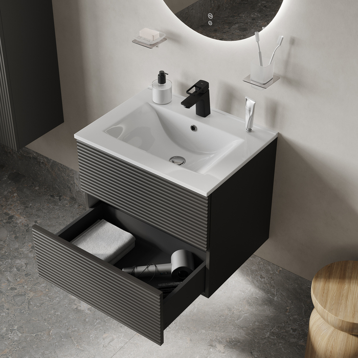 - Компактная подвесная тумба для ванной комнаты Bild с умывальником и выдвижными ящиками – красивый дизайн с трендовой горизонтальной фрезеровкой в сочетании в сочетании с популярным темно-серым цветом, удобством и практичностью.