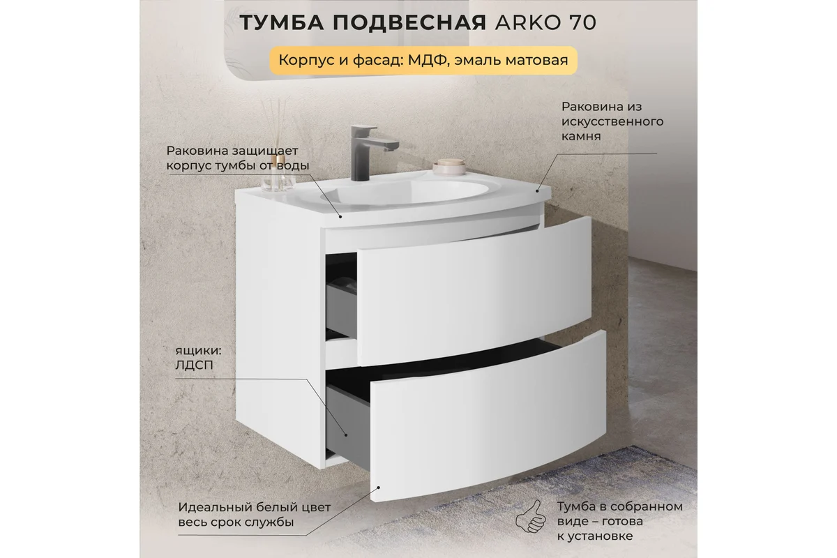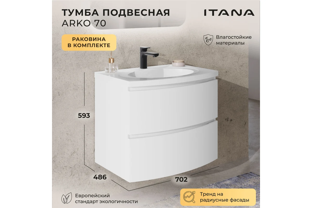 Тумба с раковиной Итана Arko 4657836461923 70 см (эмаль белый матовый) подвесная